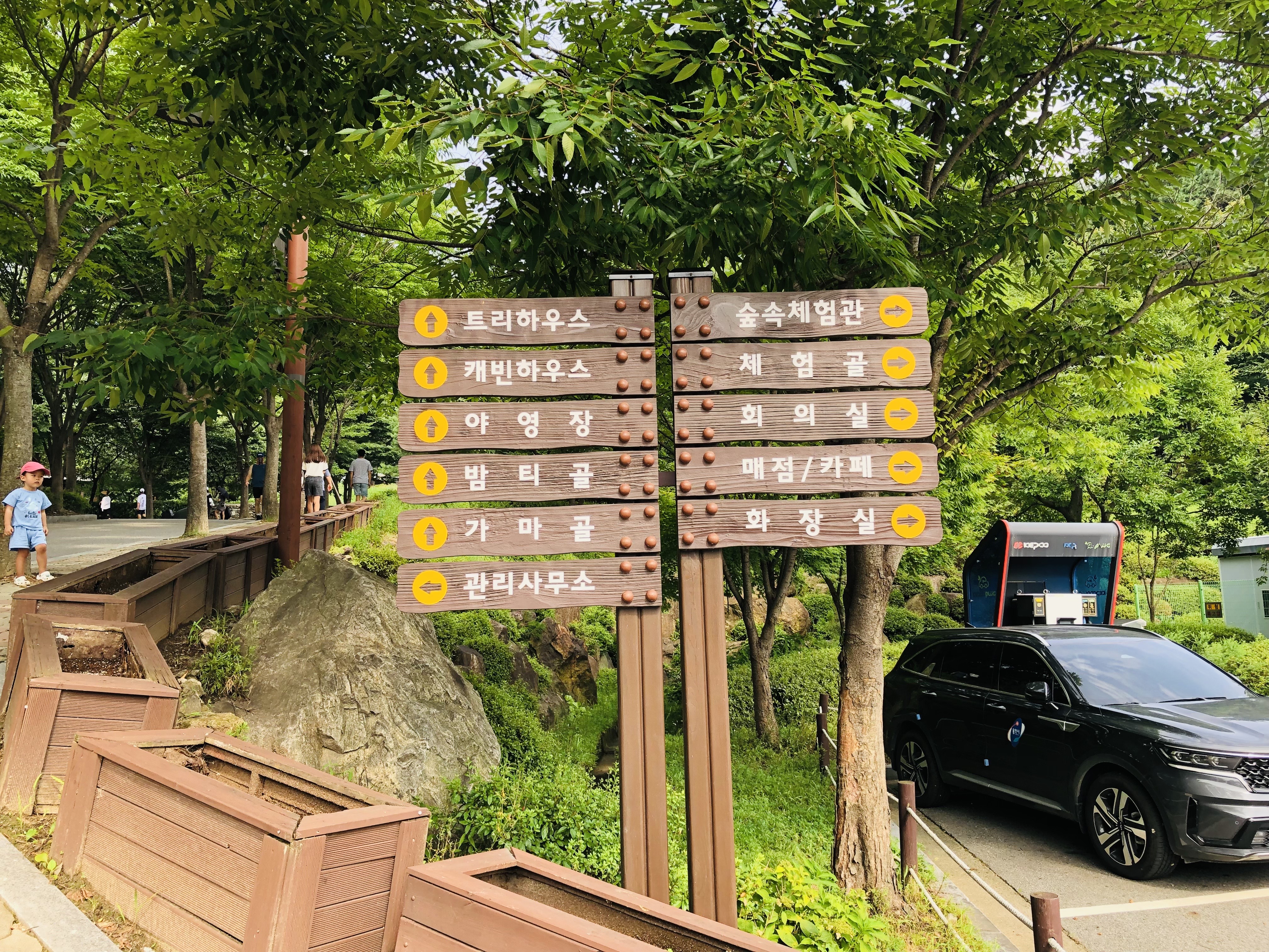 표지판만 봐도 휴양림 내부에 얼마나 많은 시설이 있는지 알 수 있습니다.